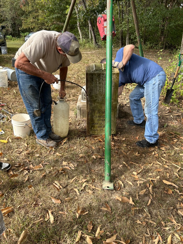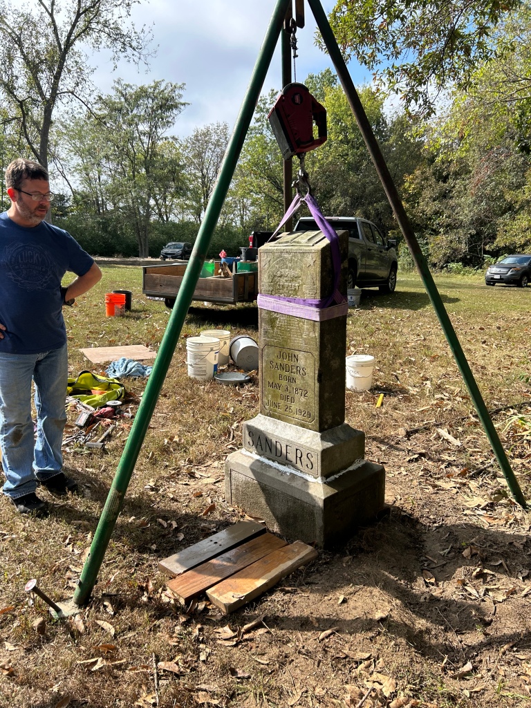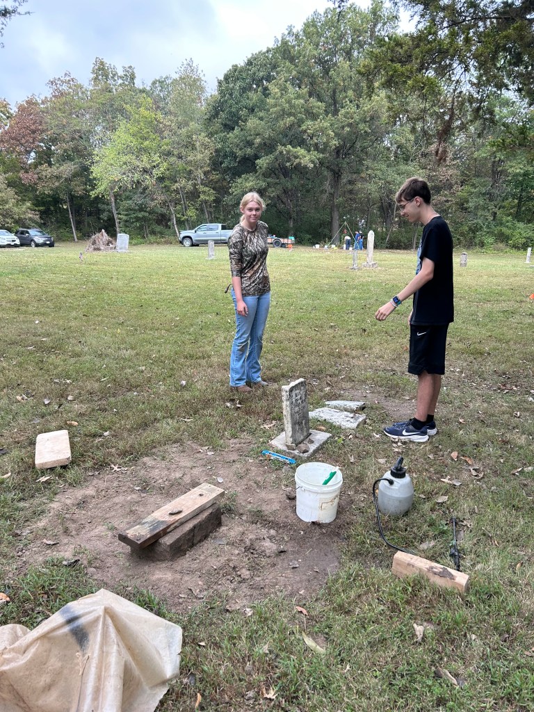 The students have spent hours tenderly cleaning headstones, locating fallen headstones, cleaning and pulling weeds, and recording history. This class, with Professor Moser, referred to as Service Learning, immerses the students in their local history in a way no regular history class ever can. The dates they study are the ones etched in stone, sometimes even concrete pieces that have placed to mark a loved one’s life. They have visited with the descendants, now members of the Wesley Smith Church on Hwy J in Wright City, because many of them are descendants of those buried at Smith Chapel. On October 11, 2025, the students and members of the community worked with Prouhet, Cemetery professional, to right the headstone of a man named John Sanders, who had been laid to rest in Smith Chapel Cemetery on June 29, 1929.