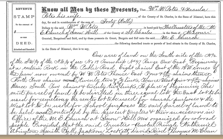 In 2024, a small one-acre of ground, in Foristell, Missouri, a special place called Smith Chapel Cemetery, which has been lovingly cared for since 1871, was listed on the National Parks Services’ National Underground Railroad. Because of that, they applied for and were granted by Congress, a grant to restore the cemetery by professional Cemetery Restorer, Jerry Prouhet and for historian, Dorris Keeven-Franke, working with Professor Grace Wade Moser at the local St. Charles County Community College and two semesters with over 75 students each semester, to help in the restoration, create Oral histories, write research on relative topics, and the people that are buried in the cemetery, and to help create four information signs. The four signs will identify the history of the property at the front gate, the former site of the one-room African American Douglass Schoolhouse, the site of the Smith Chapel A.M.E. Church, and the history of the Cemetery and are being paid for by the National Park Services grant.